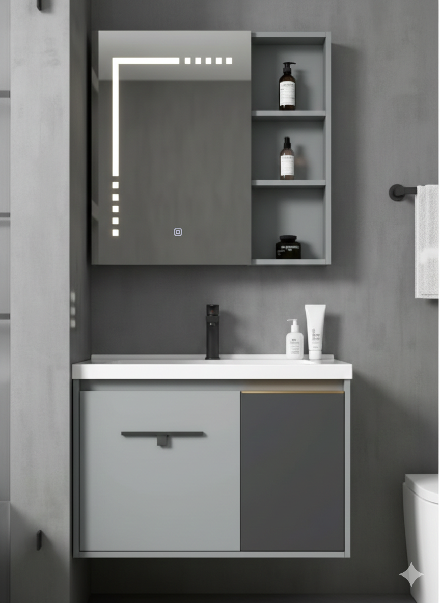 This compact 60cm wall-mounted vanity is perfect for space-saving modern bathrooms. It features a sophisticated dual-tone grey and charcoal finish with a minimalist handle